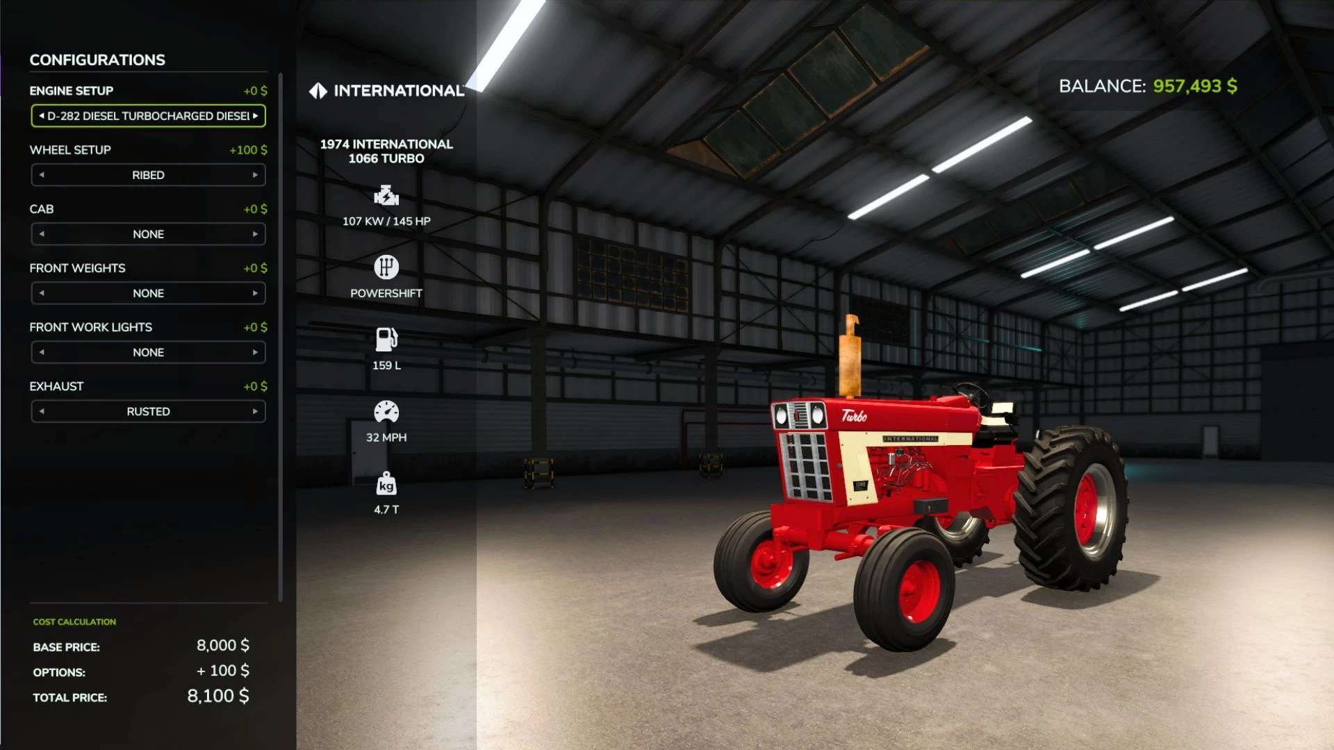 The International Harvester Farmall 1066 was made by International Harvester from 1971 to 1976. The 1066 has a six-cylinder diesel engine and about 105 drawbar and 125 PTO horsepower. Ours has been both engine power and speed (33 mph) increased for todays demanding farming tasks. The 1066 is significant for its popularity, with over 50,000 units having been built in its six-year run. There were two variations of the 1066, those being the more standard turbocharged 1066, and the Hydrostatic transmission options, We have made the Turbo variant along with the industrial version. both detailed by their respective hood decals and or color. The hydrostatic version is described to have had greatly less power than the more standard turbo variation 1066.