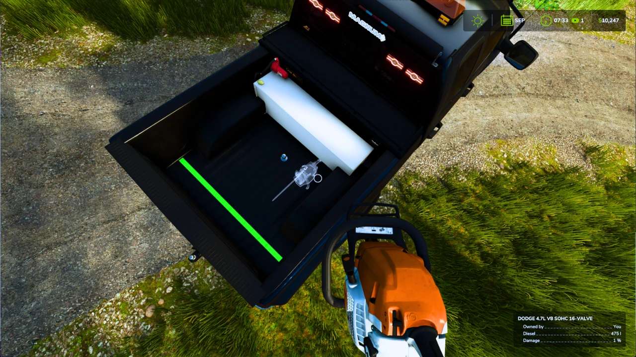 “!! NOTE !!” – To use the On The Field Equipment Repair feature you activate it by pressing X key on keyboard then have what ever piece of equipment your trying to repair next to the rear of the truck. You should be prompted by money being deducted for the repairs if done successfully and correctly. The Chainsaw Storage feature is best and easiest activated by the back door area of the passenger side of the cab. You should see a prompt to press R key on your keyboard to store or take your chain saw.