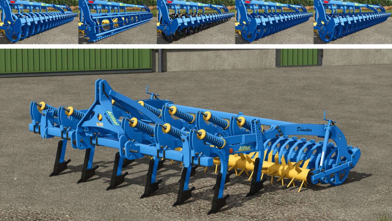 The ACTISOL Demeter is a soil loosener equipped with two rows of independently spring-loaded tines, combined with two tandem-mounted rollers. The first roller, a mixing roller, promotes soil/straw blending or deep seedbed preparation. The second roller, chosen according to soil type (Cage, Flexol, Unisol, Wellsol, or Texsol), ensures depth control and optimal reconsolidation, providing effective adaptation to various working conditions.
