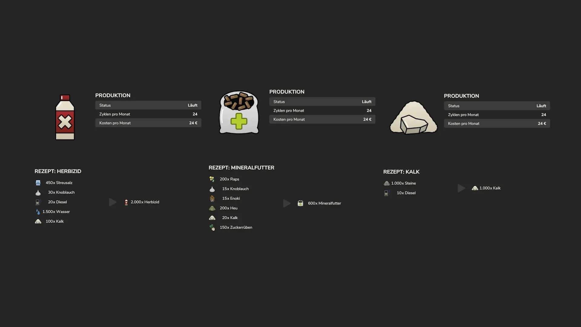 Lime, mineral fertilizer, liquid fertilizer, seeds, herbicide, and mineral feed can be produced here.