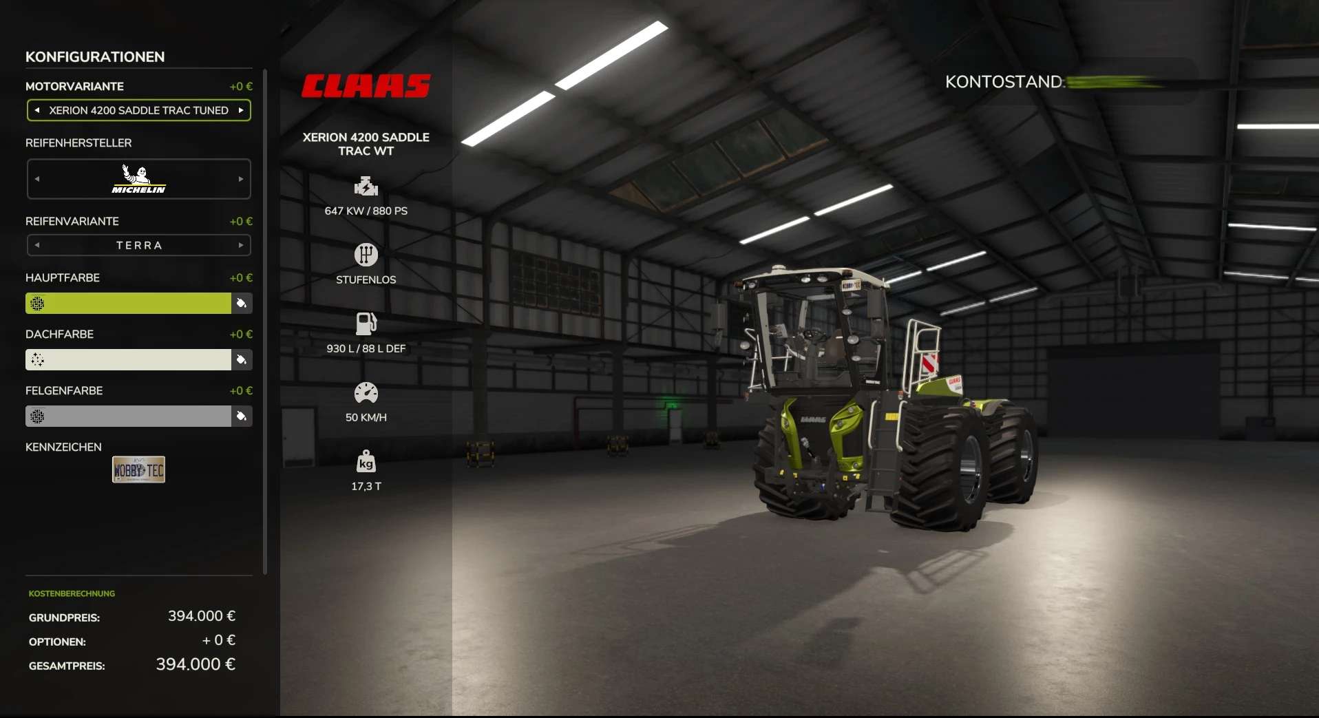 Color selection adapted (Claas Grün Metallic as the only default color in metallic)