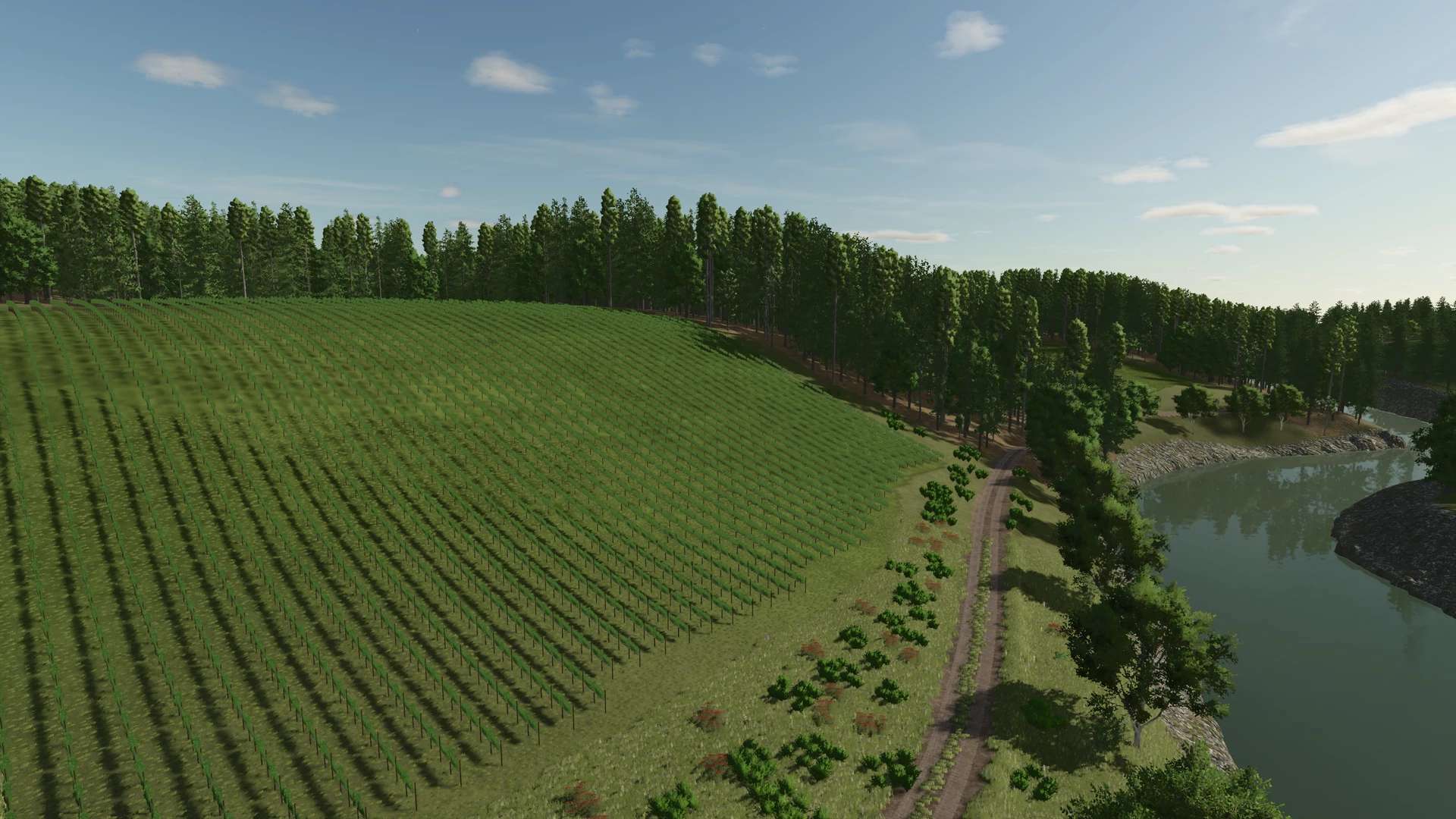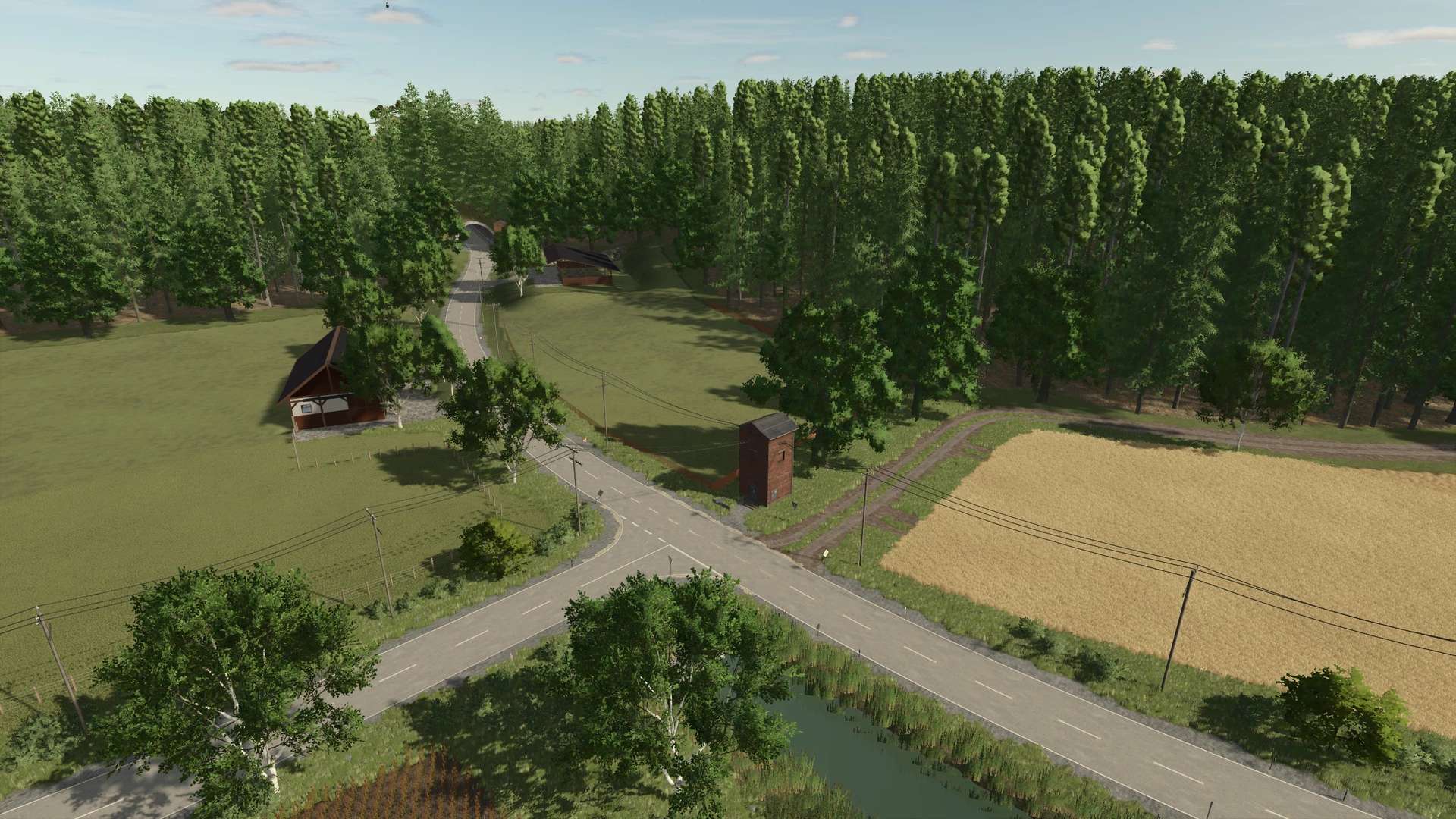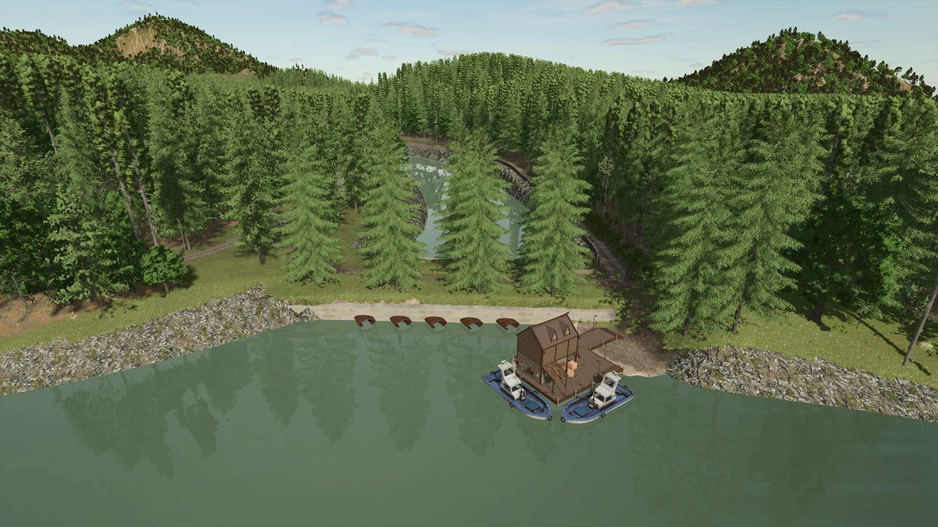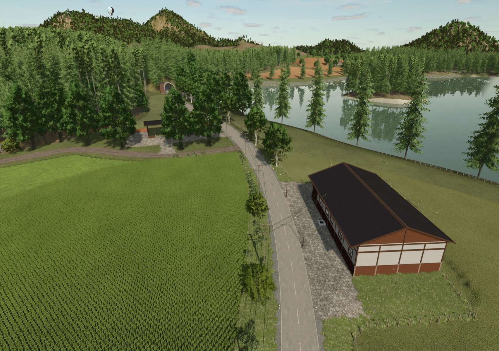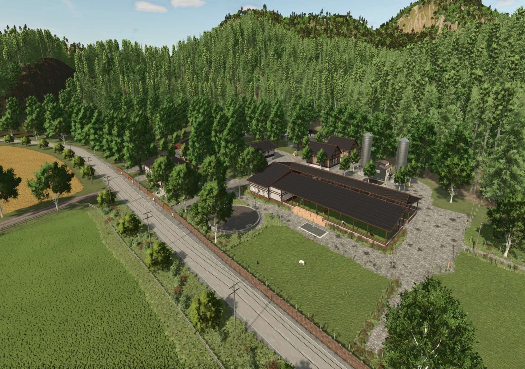 This fictional map for Farming Simulator 25 takes you to a hilly and diverse region. The area is divided into two valleys connected by several tunnels, creating exciting roads and a particularly varied landscape.