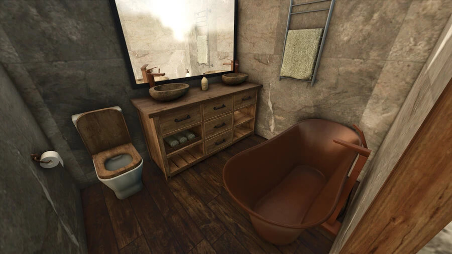 The villa is fully functional in a mountain style; I believe its style would fit any map. The furniture, entrance door, light switches, electrical outlets, and interior lighting were designed and created by me. (If you want to use them in mods, please ask for my permission – don’t take them as your own, be polite and intelligent – ask.)