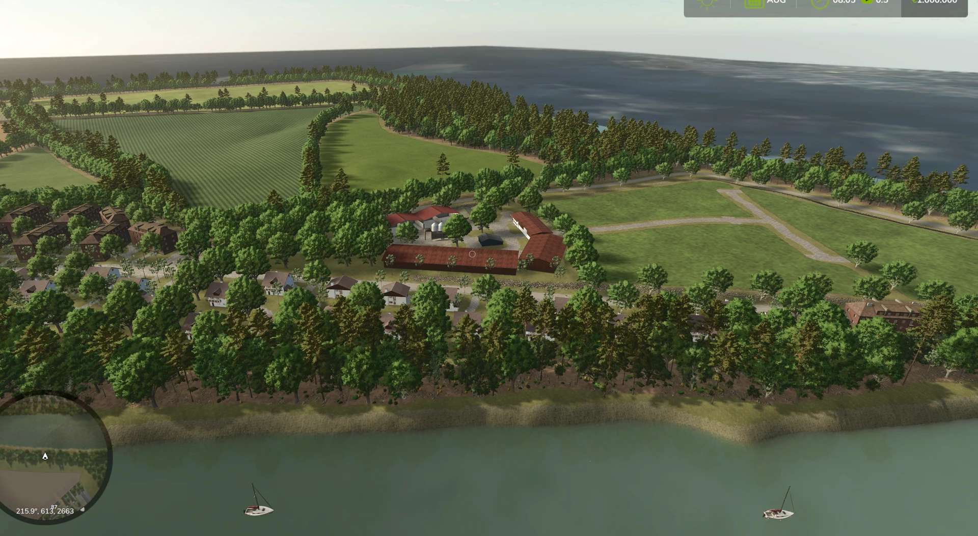 Farm Two: A large animal breeding farm with two pigsties, two sheep/goat pens, two large chicken coops (2,000 birds each), and two cow barns with feeding robots.