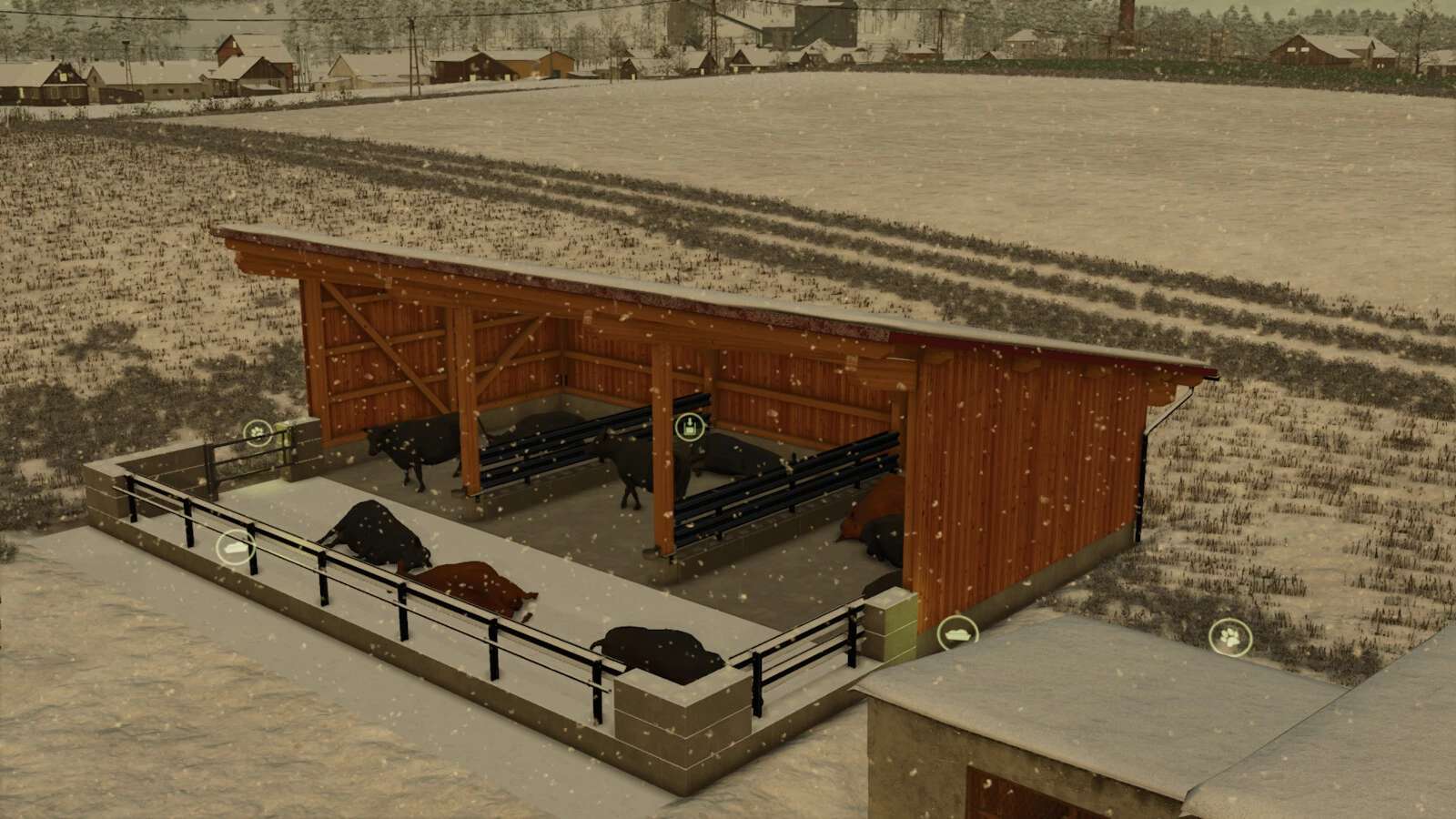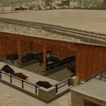 This pack consists of two small, open buildings. One of them includes a cattle barn for livestock, and the other a shelter for equipment, pallets, etc., as well as a bulk bunker for storing manure or similar materials.