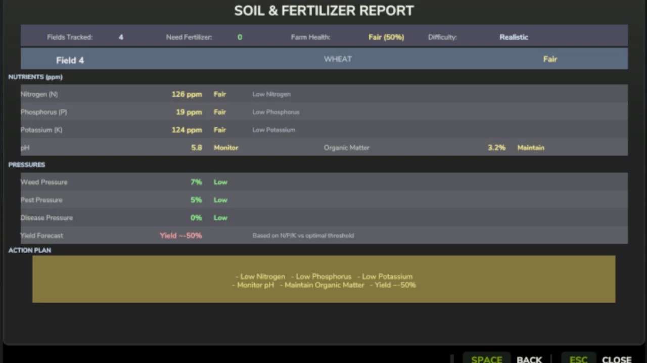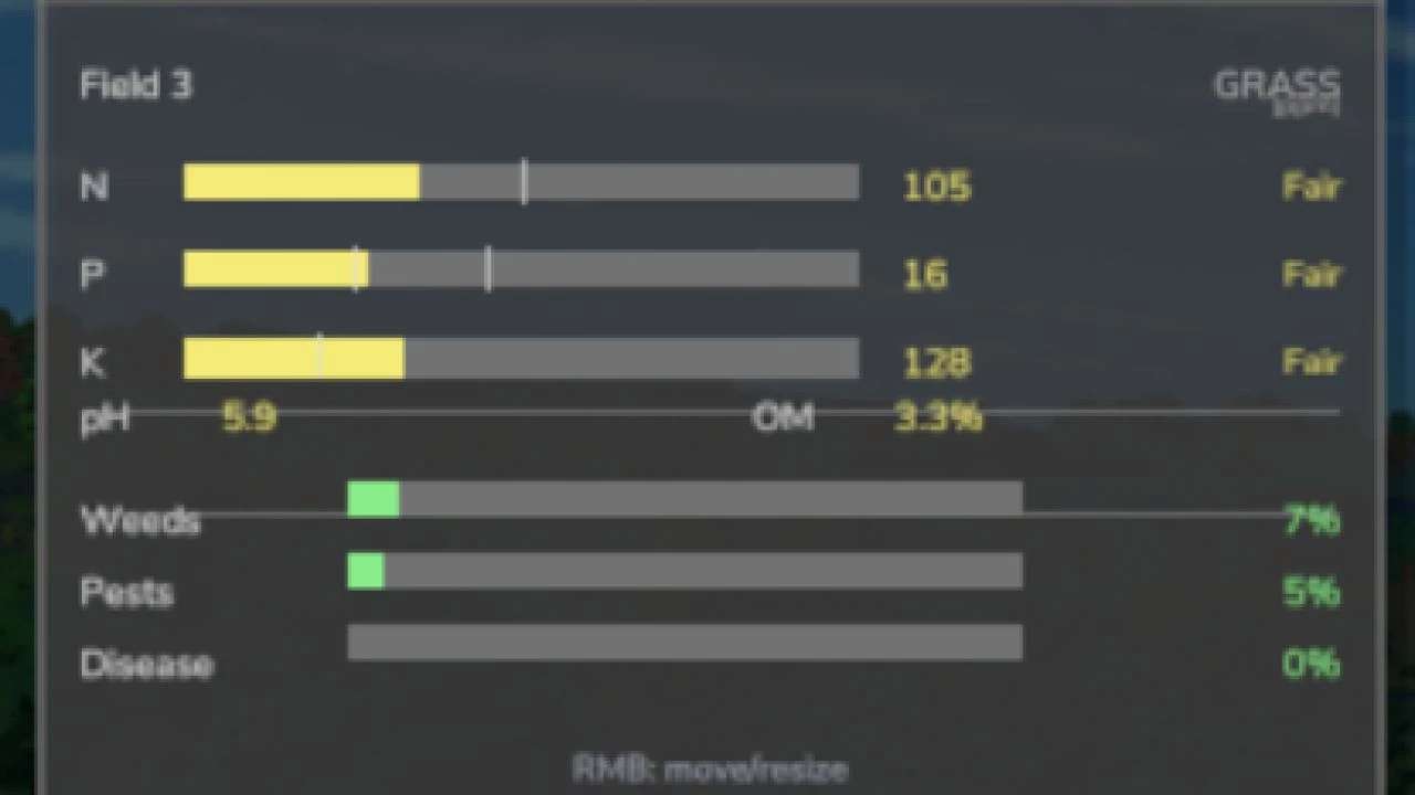 Adds meaningful depth to farming without overwhelming complexity. Every field has its own soil health — nitrogen, phosphorus, potassium, organic matter, and pH — that changes based on what you grow, what you apply, and what the weather does. Ignore your soil and yields will suffer. Manage it well and your farm runs more efficiently.