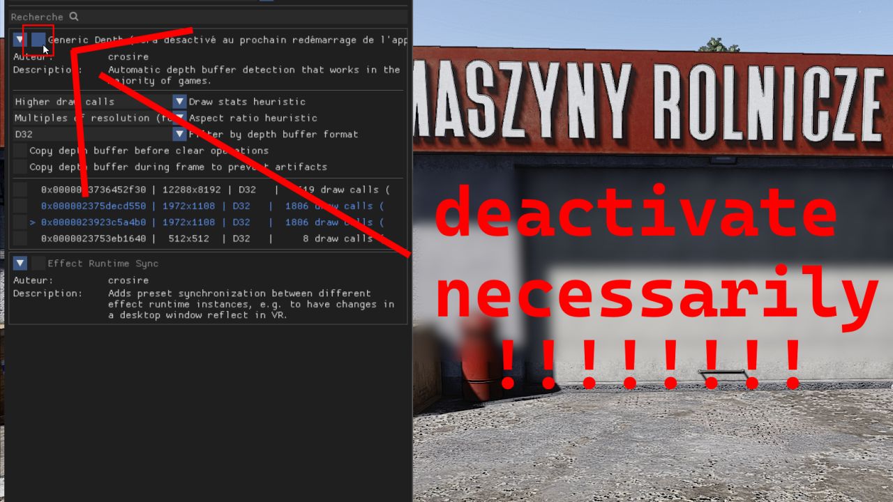 – Mandatory removal of (Generic Depth) from the reshade in the (Add-ons) tab as shown in the 4th photo