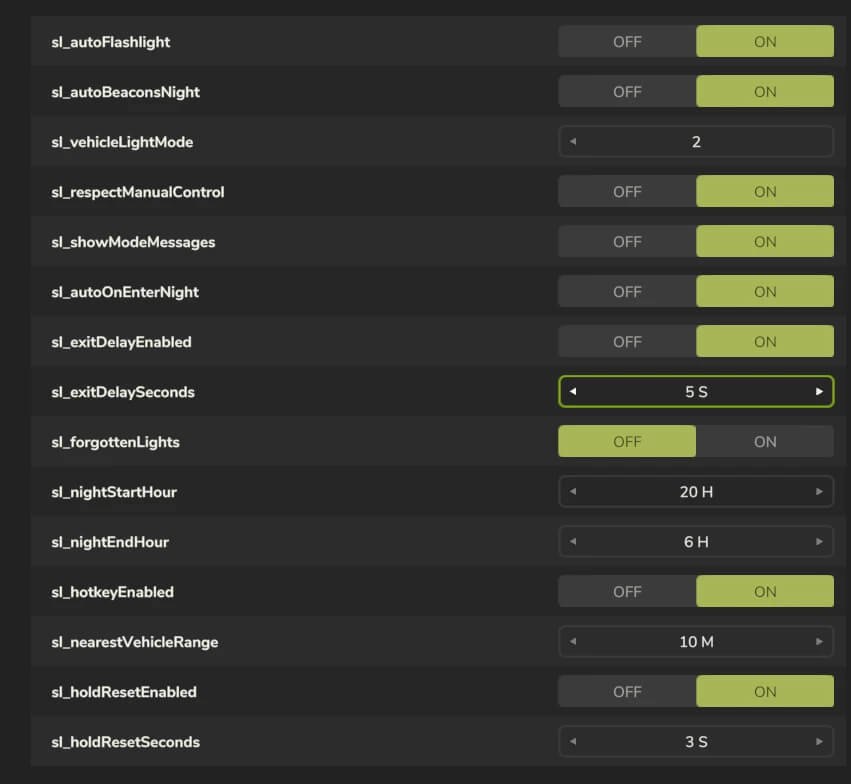 – All aspects of the mod are fully customizable. To configure them, go to Menu – General Settings – Smart Auto Light category.