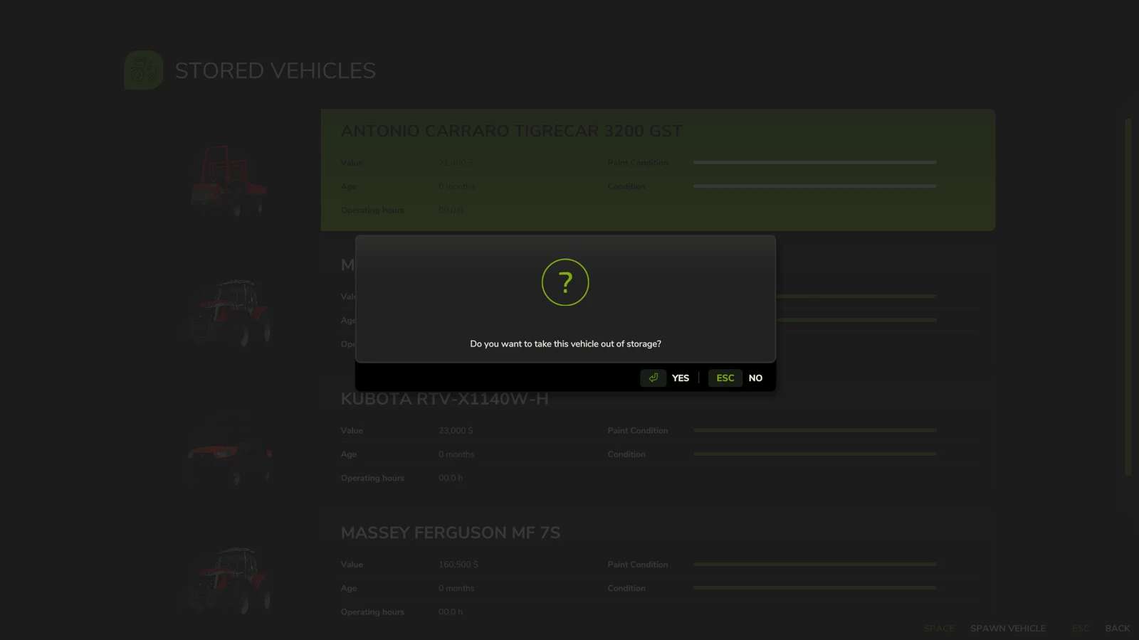 – Requires Farm Manager permissions to spawn stored vehicles.