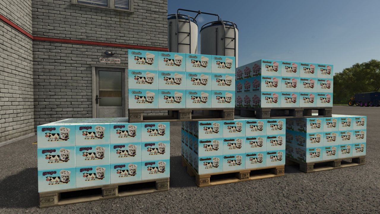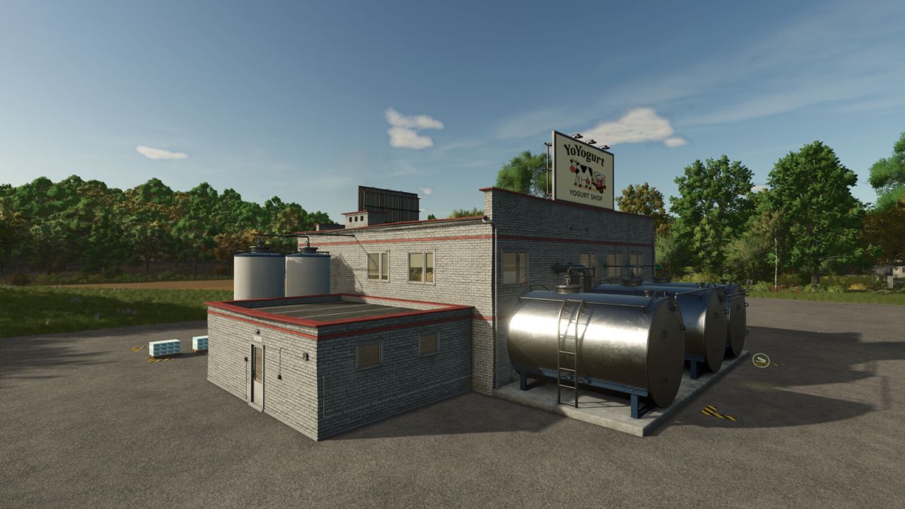A modern, customized factory with illuminated signs and billboards that make it recognizable and immersive. Perfect to expand your dairy chain with high-value products!